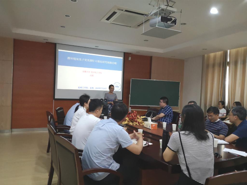 7月29日上午,在北校区知达楼新型环保重点实验室会议室,安徽大学冯燕副教授为我校师生作题为《微环境双光子荧光探针可视化研究细胞自噬》的学术报告。报告会由建材研究院副院长、新型环保重点实验室副主任杨秀丽主持,化学化工学院院长奚新国和材料科学与工程学院院长张勤芳出席,建材研究院、化学化工学院、材料科学与工程学院等学院师生聆听了报告。