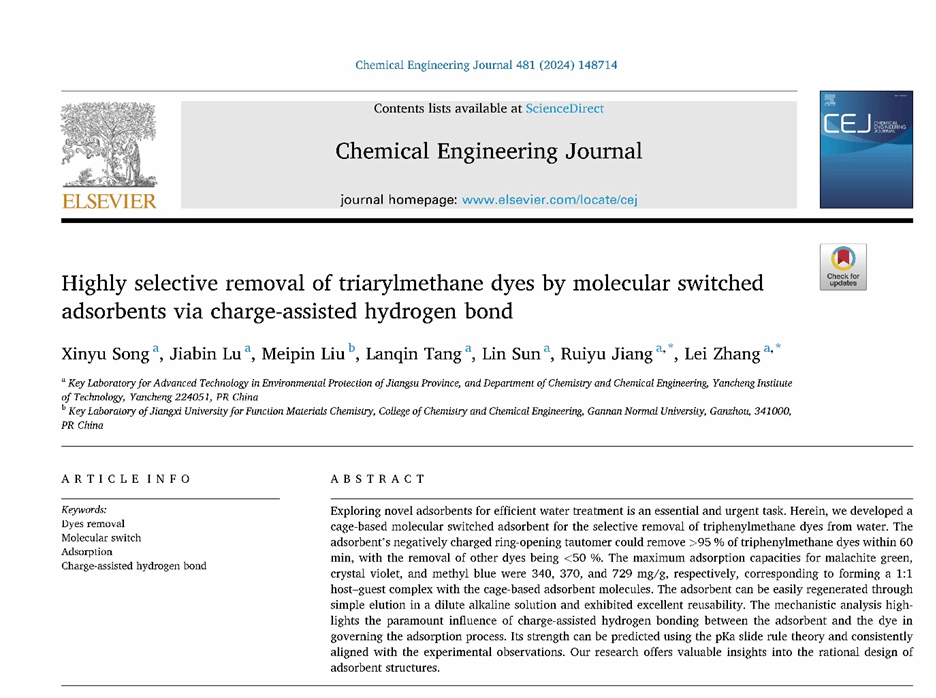 近日,我室宋欣钰博士在化工领域期刊《Chemical Engineering Journal》(IF = 16.7)上发表了题为“Highly selective removal of triarylmethane dyes by molecular switched adsorbents via charge-assisted hydrogen bond”的最新研究成果。