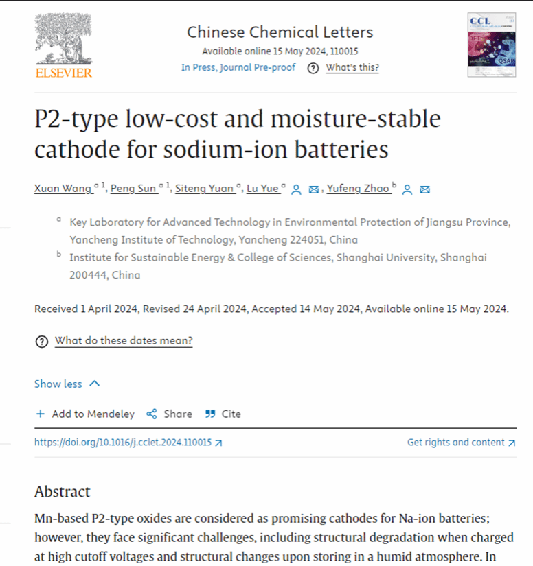 近日,我室王轩博士在化学领域期刊《CHINESE CHEMICAL LETTERS》 (TOP,IF=9.1,中科院1区)上发表了题为“P2-type low-cost and moisture-stable cathode for sodium-ion batteries”的最新研究成果。