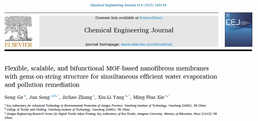近日,以盐城工学院硕士研究生葛淞同学为第一作者,我室宋骏博士,解明华及杨秀丽教授为通讯作者,盐城工学院为唯一通讯单位的研究论文“Flexible, scalable, and bifunctional MOF-based nanofibrous membranes with gems-on-string structure for simultaneous efficient water evaporation and pollution remediation”在材料、化工领域一区TOP期刊《Chemical Engineering Journal》上发表(该刊2024年影响因子为13.4)。